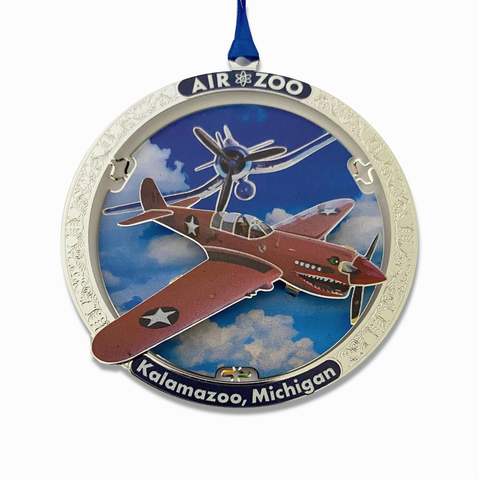 Celebrate this holiday season with an Air Zoo exclusive ornament. Featuring Air Zoo co-founder, Sue Parish's P-40 Warhawk.