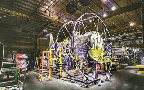 Celebrate the Air Zoo's nationally renowned aircraft restoration center with this acrylic magnet. This magnet features a shot of the affectionately named "rotisserie", the restoration shop's fixture that holds and rotates the aircraft fuselage during restoration efforts (seen here with the FM-2 Wildcat installed within).