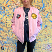 This pink flight jacket has a classic design and is inspired by the U.S. Air Force Women Air Service Pilots of WWII (W.A.S.P.). Includes 6 decorated patches: Women's Air Service Pilot Medal, F/A 18 Hornet, F-16 Fighting Falcon, T-7A Red Hawk, AH-64D Longbow Helicopter, and the American Flag.