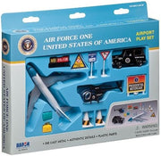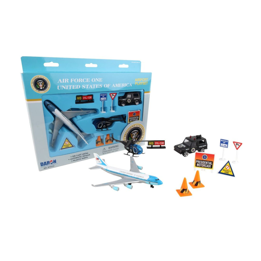 Made from durable diecast metal and plastic, this set includes a presidential plane, Secret Service jeep, helicopter and a variety of signs with the official licensed insignias.