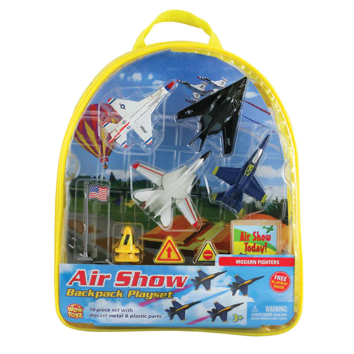 Kids can bring the air show home with this playset! This backpack 10-piece playset comes with four high quality diecast metal airplanes and plastic accessories. Also includes realistic playmat with matching game on the back. Set includes everything that’s needed for a fun fantasy playtime, then when kids are done, they can pack their toys up and carry them away! For ages 3 & up.