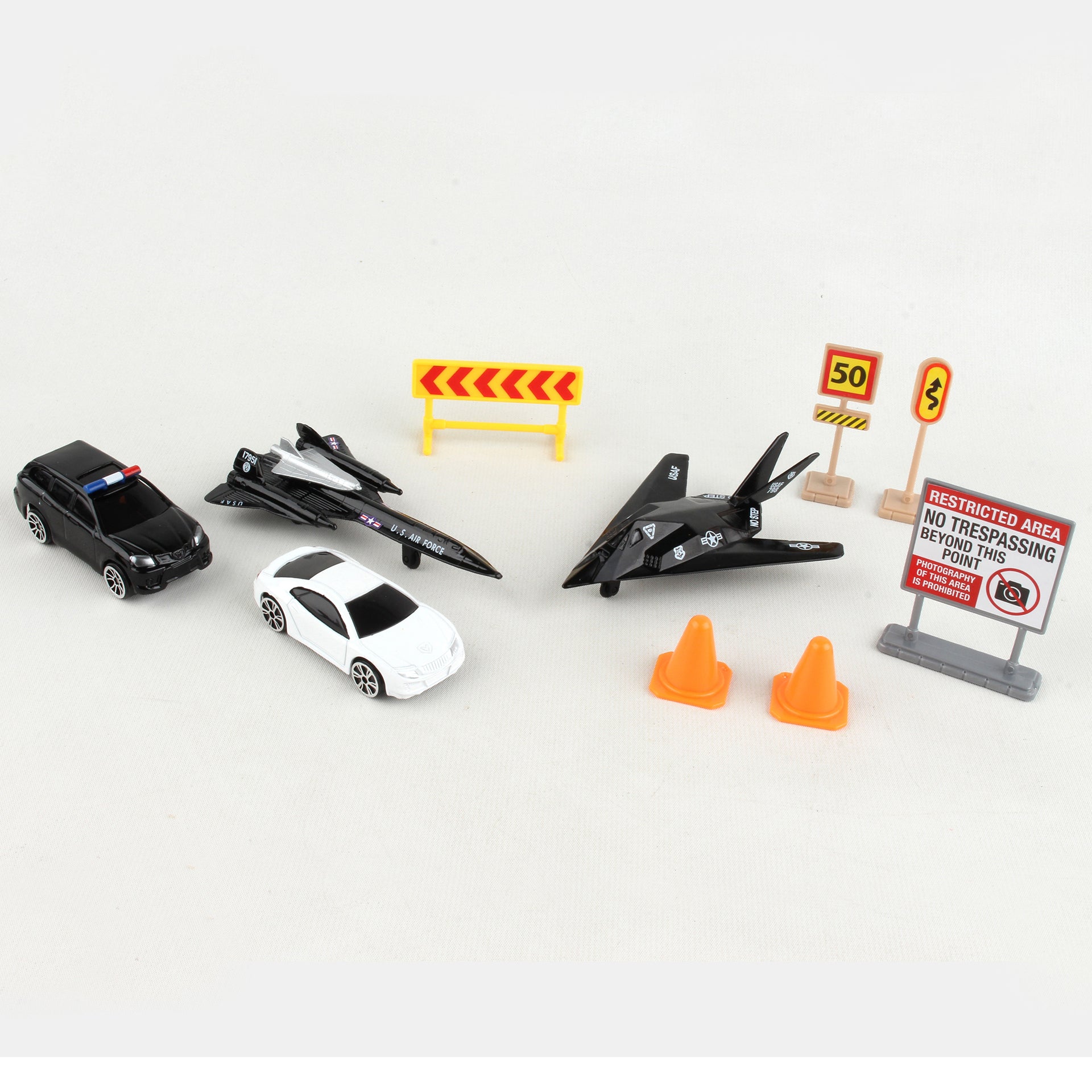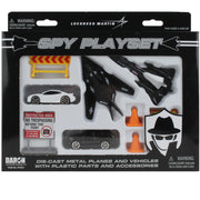 This diecast and plastic Spy playset comes with four street signs, two traffic cones, one white undercover car, one black police car, one F-111 and one SR-71 spy plane.