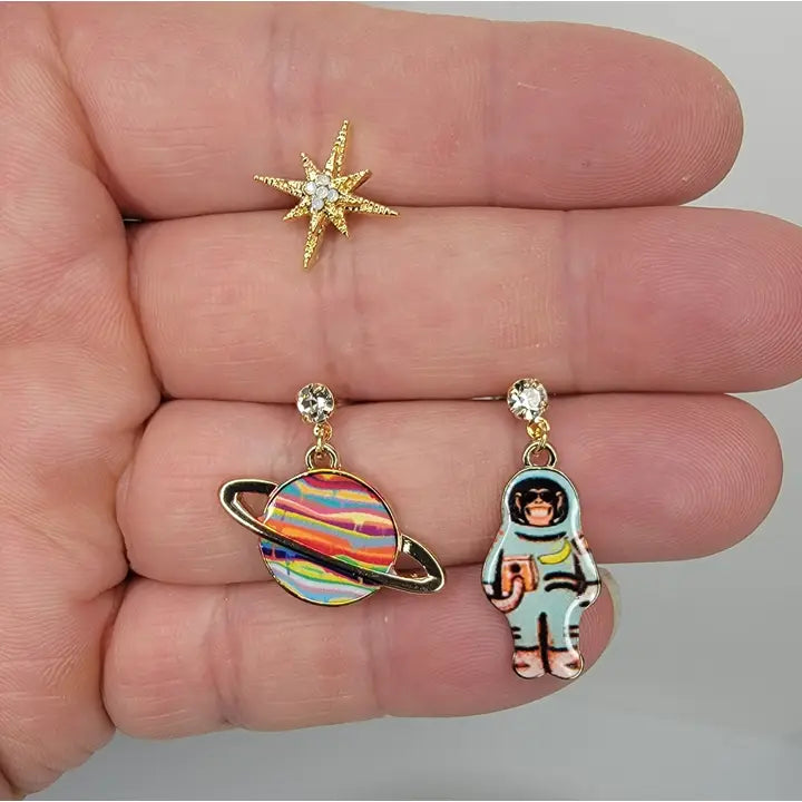 Make a style statement with our Unmatching Planet Earrings! These adorable monkey and space earrings are unmatching for a unique touch. Express your love for animals and the cosmos with these cute and quirky earrings. Stand out and let your personality shine with these one-of-a-kind accessories.