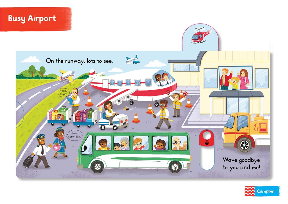 A first novelty board book about a busy airport, with push, pull and turning mechanisms.