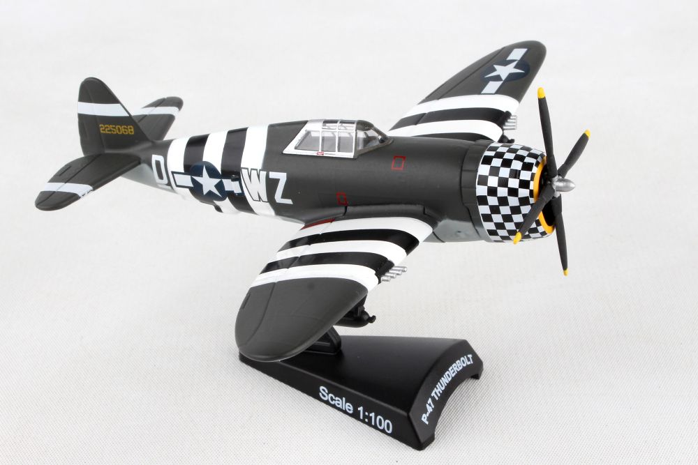 This Die-cast metal airplane model comes in 1:100 scale with plastic stand and is approximately 4 1/4 inches long with 4 3/4 inch wingspan. The P-47 Thunderbolt was a fighter-bomber used by the United States Army Air Forces during World War II. Over 15,000 planes were built during its operational lifetime. With the aid of drop tanks (auxiliary fuel tanks), the P-47 could cover long distances and was feared because of its eight .50 caliber guns. The P-47 was the heaviest single engine WWII fighter and the first piston powered fighter to exceed 500 mph.