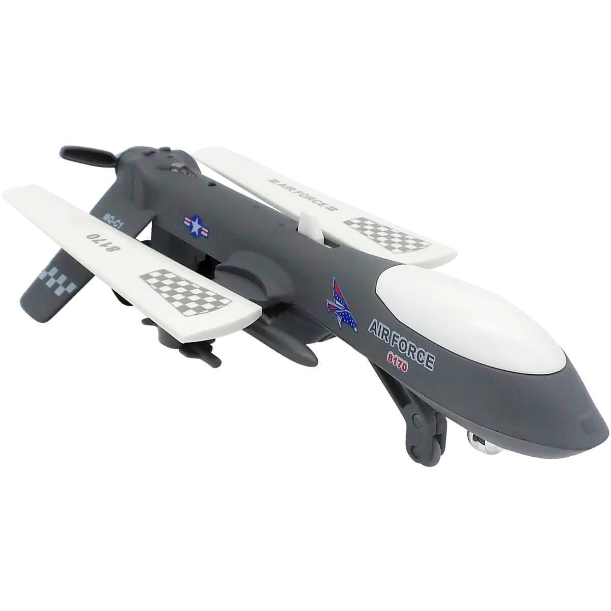 Ever wanted to fly your own Predator Drone through the dark and stormy clouds? The Predator Drone Pullback with light and sound brings a new element to your imagination, with a pull-back and release mechanism that makes for a low, fast launch across smooth surfaces. The cockpit opens and closes and there are realistic drone sounds and lights that emit and flash when the plane gets rolling. Drone is made of diecast and plastic and has rubber pullback and release wheels; wings fold in and out.