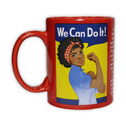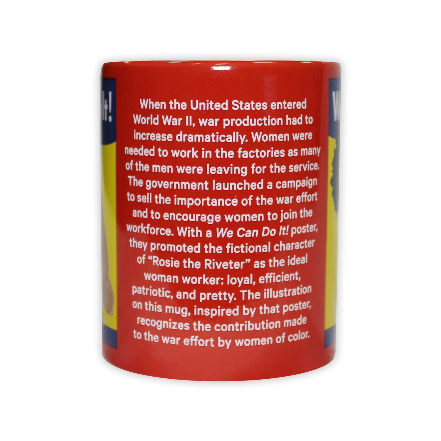 When the United States entered World War II, war production had to increase dramatically. Women were needed to work in the factories as many of the men were leaving for the service. The government launched a campaign to sell the importance of the war effort and to encourage women to join the workforce. With a We Can Do It! poster, they promoted the fictional character of "Rosie the Riveter" as the ideal woman worker: loyal, efficient, patriotic, and pretty. The illustration on this mug, inspired by that poster, recognizes the contribution made to the war effort by women of color.