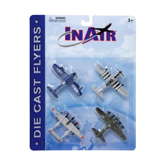 This is a fun assortment of four authentically detailed, bestselling World War II airplanes including the B-17 Flying Fortress, F4U Corsair, P-38 Lightning and the P-51 Mustang. Includes educational packaging with Top Ten Aviation Fun Facts.